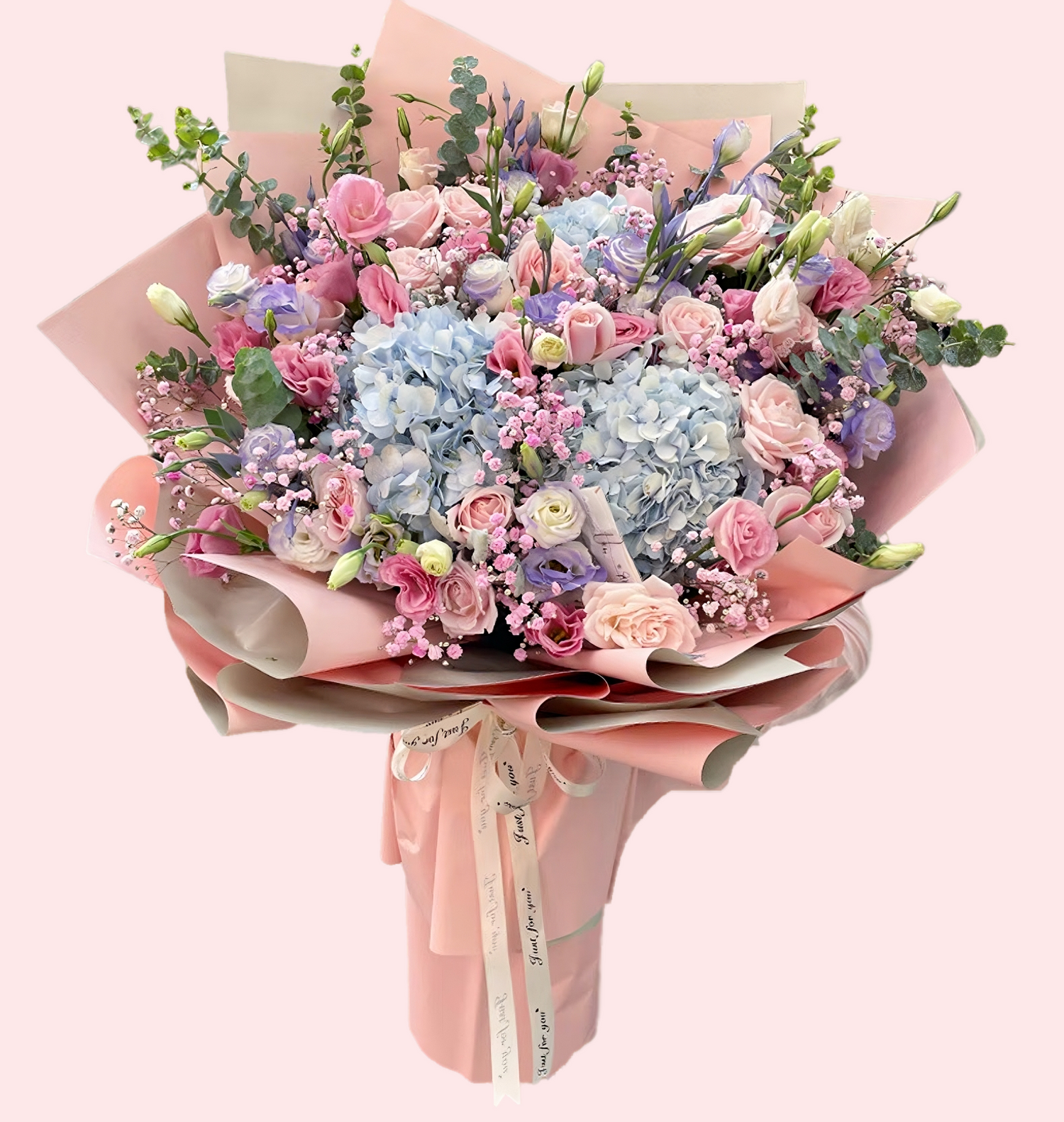 粉紅玫瑰,繡球,乒乓菊,桔梗,滿天星,洋甘菊花束