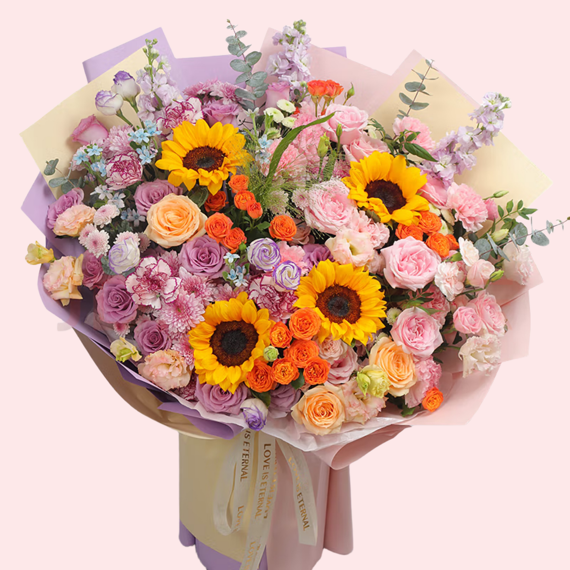 這款花束以 4 枝向日葵 為視覺焦點,象徵陽光、力量與祝福,搭配多種玫瑰(粉色、紫色、香檳色),再以紫色康乃馨、小藍花、泡泡花層層襯托,呈現出一種溫暖、繽紛、充滿希望的花語。