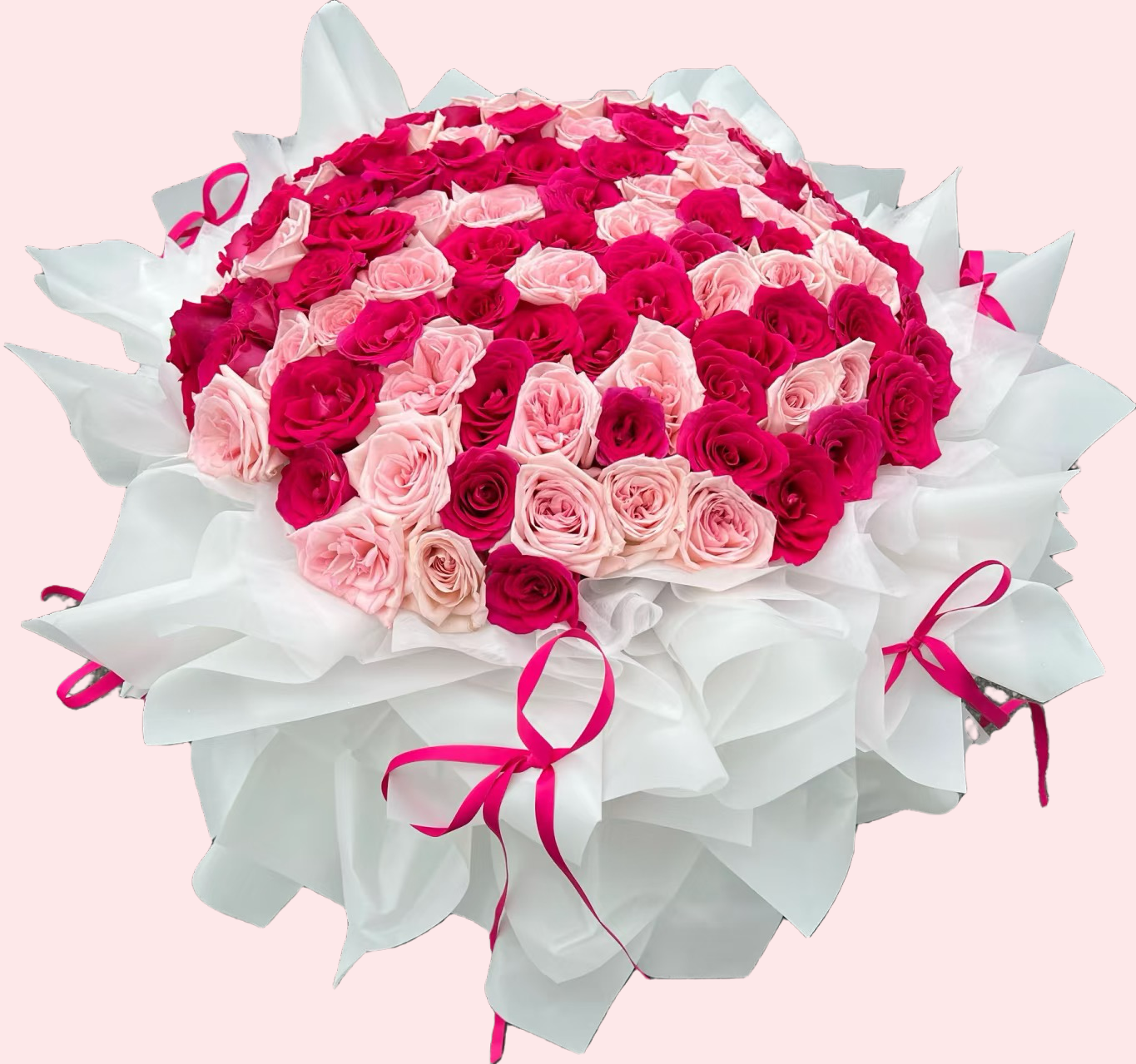 99朵心形或圓形粉紅和紅色混搭玫瑰花束