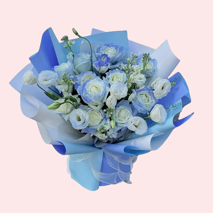 這款花束以獨特迷人的 碎冰藍玫瑰 為視覺焦點, 感覺神秘、深情、夢幻愛意,搭配 白色桔梗 的純淨與 紫羅蘭 的高貴冷艷,層次豐富、色調柔和,是一款不流俗的浪漫花束。