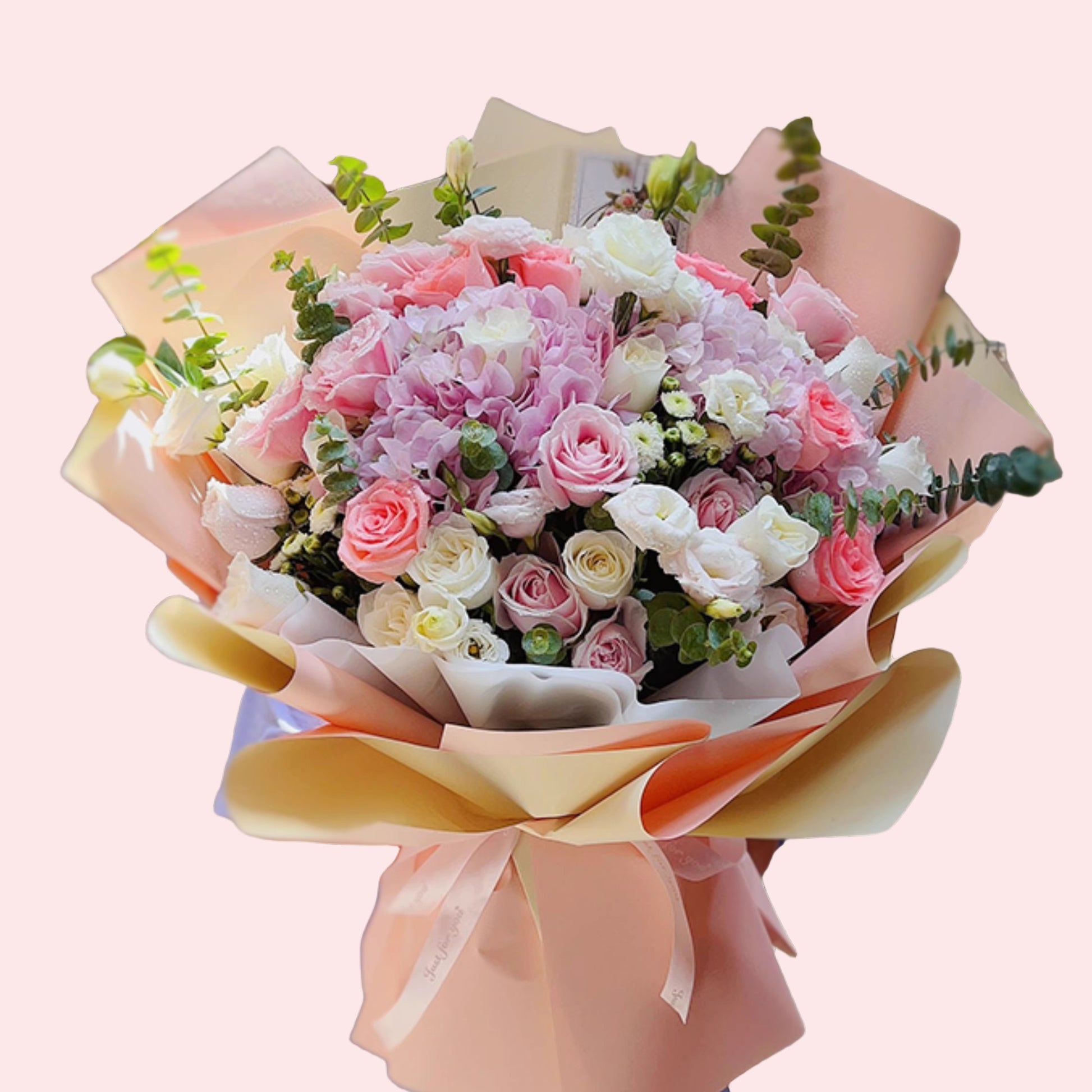 韓系浪漫玫瑰繡球花束|柔情純白・粉色心語