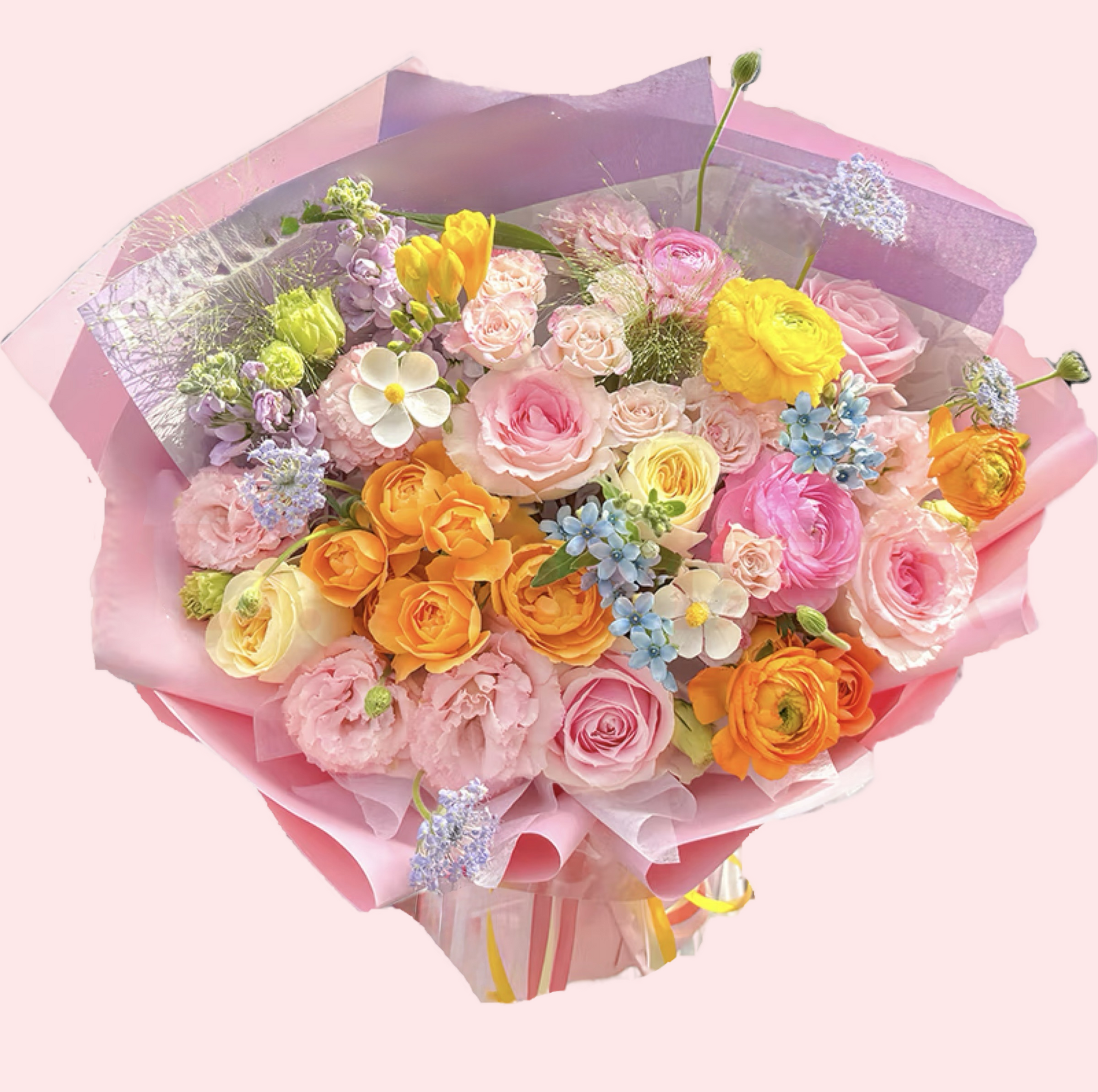 這款花束以粉玫瑰、粉橘玫瑰、香檳玫瑰為主體,搭配桔梗、紫羅蘭與白色小花,色彩層次由粉嫩至明亮,猶如春日晨光灑落花田,清新、溫柔又充滿生命力,讓人一見傾心。