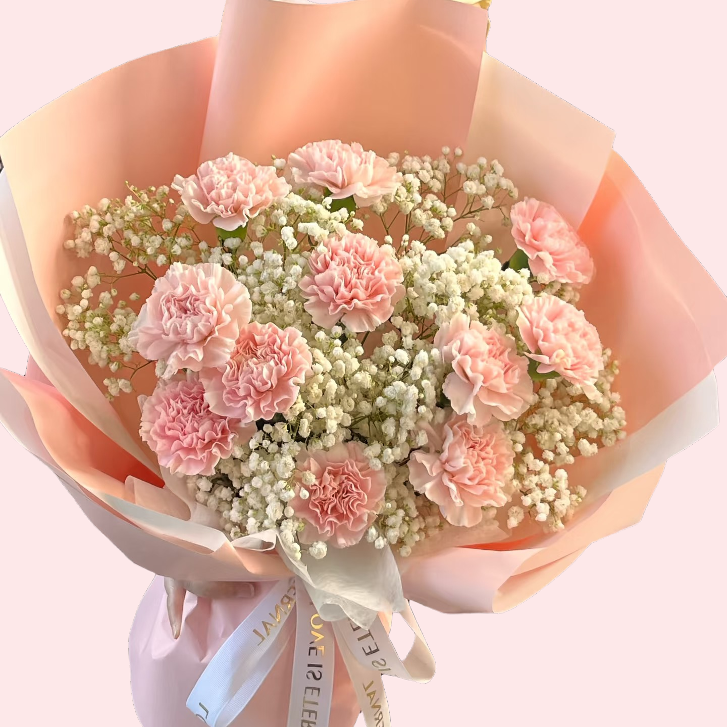 粉色康乃馨代表著溫柔的愛與感激之情,滿天星則象徵永恆的陪伴與守護。這束花,不華麗,卻溫暖人心。