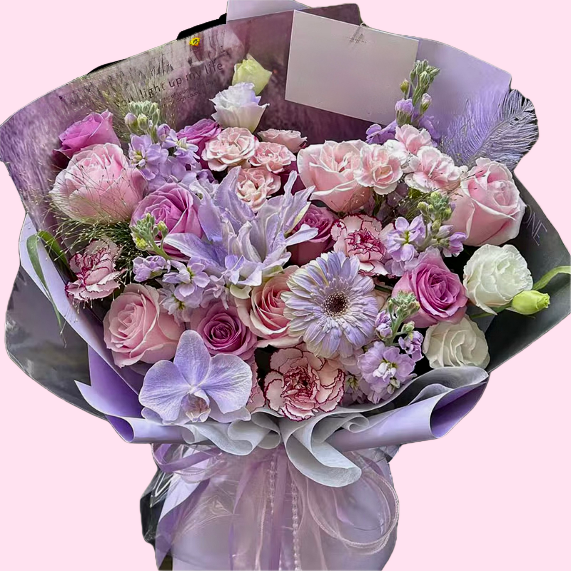 柔霧紫色調交織出一場浪漫幻想,紫玫瑰象徵神秘的愛與祝福,搭配蝴蝶蘭、非洲菊與粉康乃馨,溫柔中帶著高雅格調。