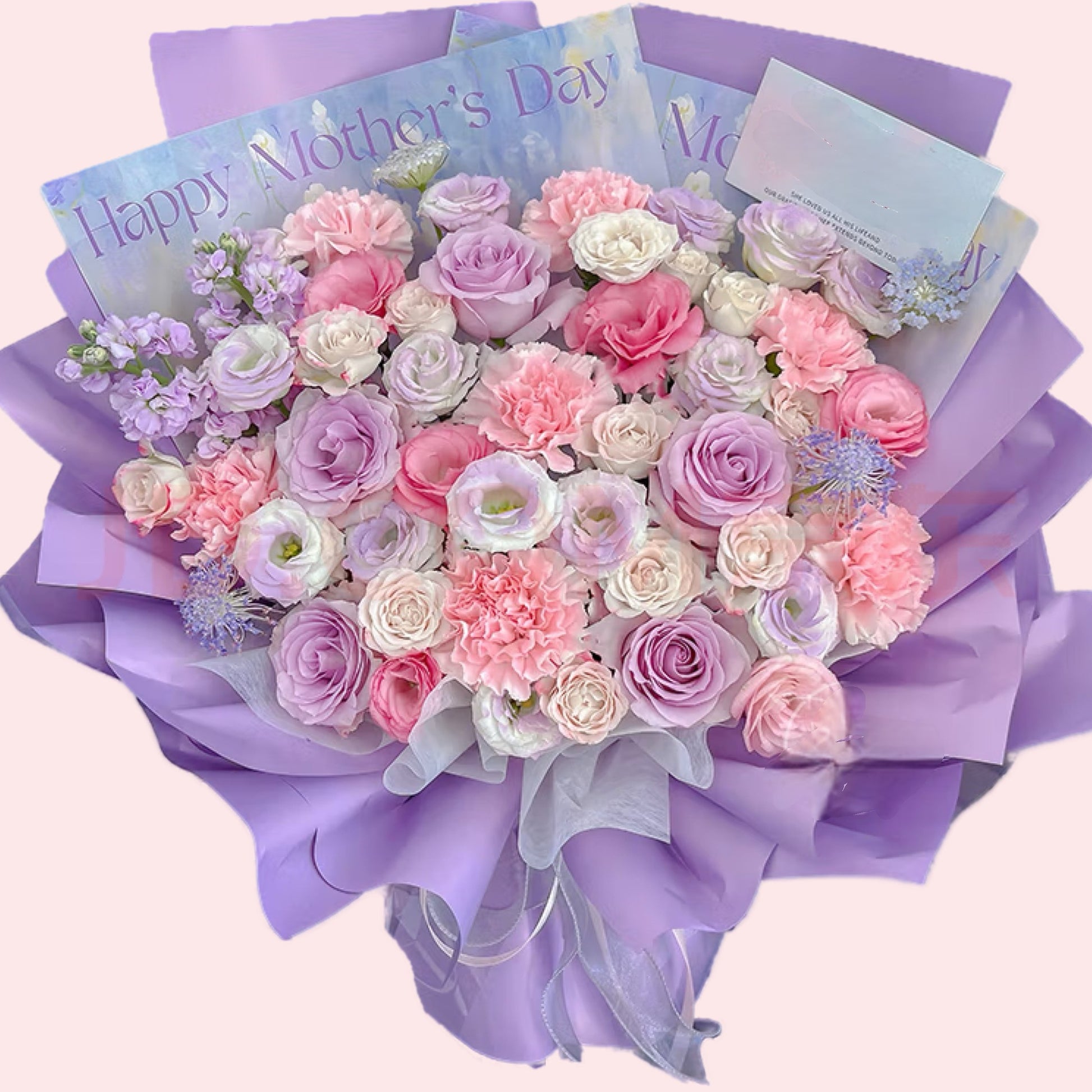 這款花束以紫色、粉色與白色為主色調,是一款集優雅、溫柔與夢幻於一身的花禮。主要花材包含:紫玫瑰、粉白玫瑰、粉康乃馨、紫羅蘭與洋桔梗,搭配層層紫色包裝紙,設計感十足,非常適合用於母親節、生日、感謝日或贈送給溫柔氣質的她。