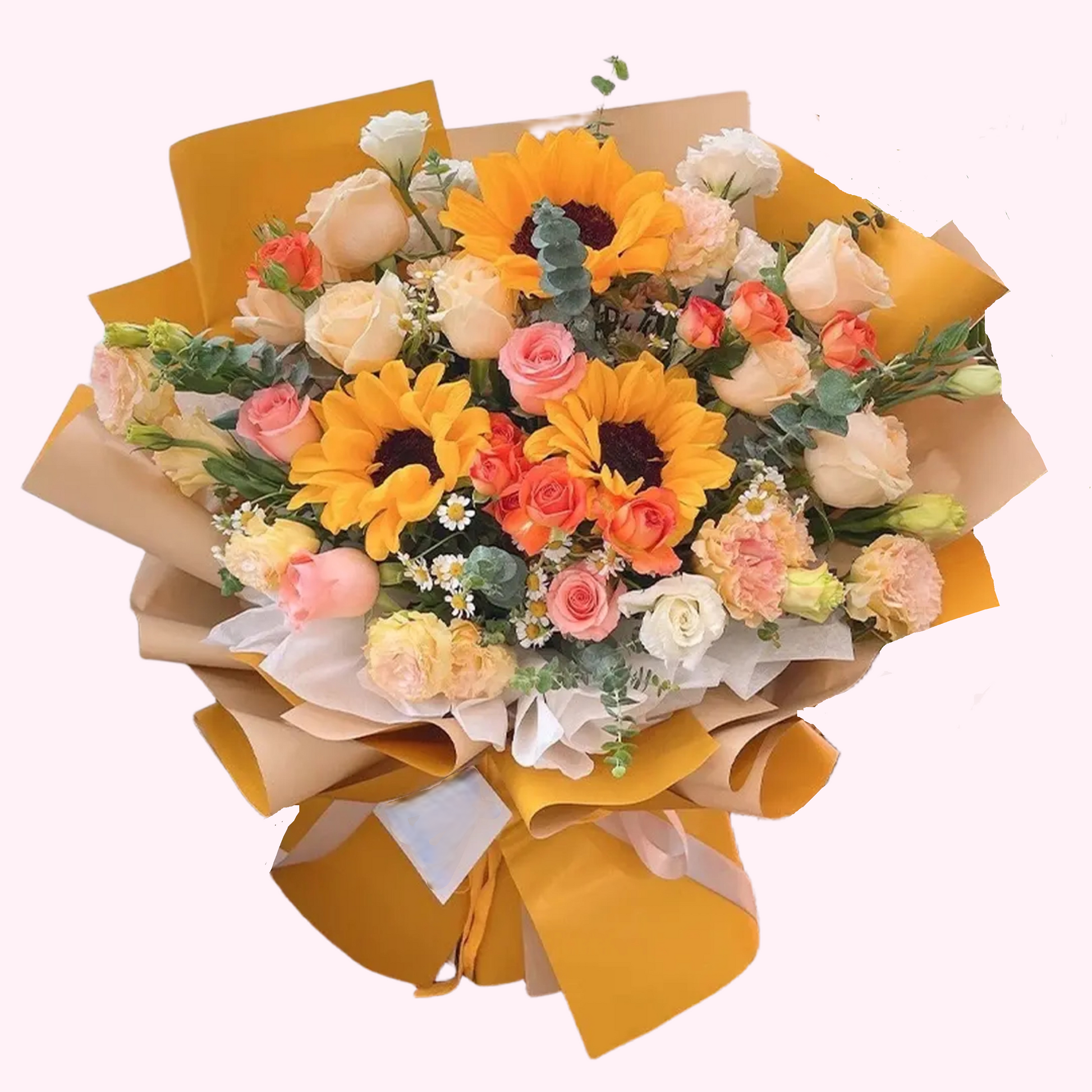 向日葵的陽光灑落,搭配柔和的玫瑰與洋桔梗,彷彿一場溫暖的擁抱,為你帶來滿滿的好心情。