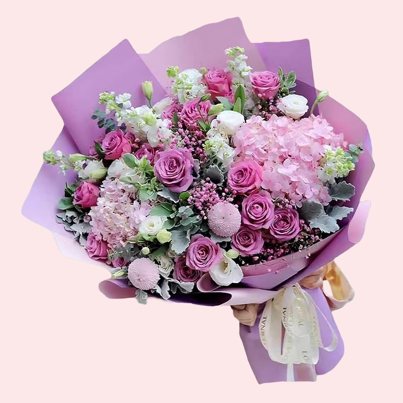 以紫玫瑰為主角,搭配粉繡球、洋桔梗與粉嫩滿天星,彷彿細語般訴說著溫柔與優雅。